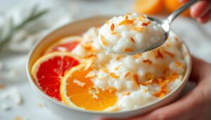 Kokos-Milchreis mit Vanille: cremig mit Zitrussalat und knusprigen Kokoschips