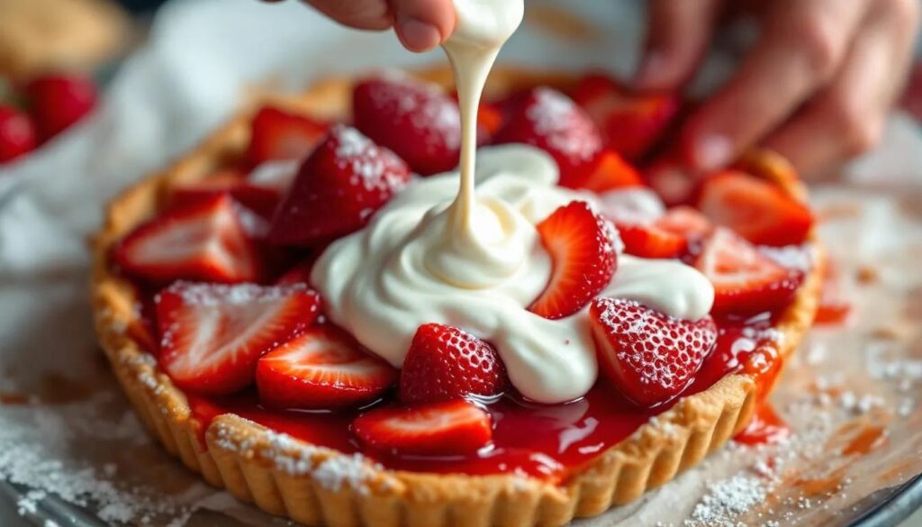Für den Belag eignen sich mittelgroße, gleichmäßige Sorten wie Elsanta oder Honeoye, die eine feste Textur und guten Glanz haben. Aromatisch besonders intensiv – und somit ideal für die Füllung oder ein Püree in der Creme – sind ältere Sorten wie Mieze Schindler oder Senga Sengana, die gelegentlich auf Wochenmärkten angeboten werden.