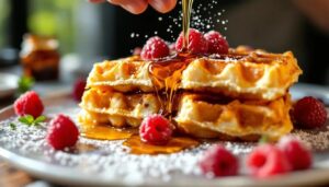 2 EL Mascarpone in den Grundteig einrühren – das macht die Waffel innen besonders samtig. Serviert mit einem Löffel hausgemachter oder hochwertiger Aprikosenmarmelade und grob gehackten ungesalzenen Pistazien. Diese Variante schmeckt nach einem Frühlingsfrühstück im Café.