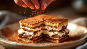 Diese Variante des Klassikers ersetzt den traditionellen Espresso durch Kokosmilch und weißen Rum, tauscht den Amaretto gegen ein Hauch Vanille und basiert auf einer Mascarpone-Creme, die durch zerbröselte Raffaello®-Kugeln eine unerwartete Textur erhält. Die Löffelbiskuits saugen sich in Kürze mit dem aromatischen Bad voll und werden dabei weich, aber nicht matschig – wenn man den Trick mit der Eintauchzeit kennt. Schürze umbinden, der Rest geht schneller als gedacht.