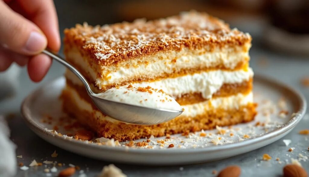 Wer kein Raffaello® zur Hand hat, kann die Kugeln durch gehackte weiße Schokolade und geröstete Mandelblättchen ersetzen. Die Kokosmilch im Tränkbad lässt sich durch Mandelmilch ersetzen, wenn man die Nussnote stärker betonen möchte. Im Sommer bietet sich auch eine Variante mit frischen Himbeeren zwischen den Cremeschichten an – die leichte Säure der Beeren bricht die Süße der Kokos-Mandel-Basis auf angenehme Weise.