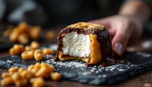 Für eine vegane Version lässt sich der Eischaum durch Aquafaba-Meringue ersetzen – das Kochwasser aus einer Dose Kichererbsen schlägt sich zu einem überraschend stabilen Schnee auf. Gelatine ersetzen Sie durch Agar-Agar (ca. 2 g pro 100 ml Flüssigkeit, aufgekocht). Die Waffelscheibe lässt sich durch einen zarten Mandelbiskuit oder einen kakaohaltigen Mürbeteigboden variieren. Im Frühling machen getrocknete Erdbeer- oder Himbeerstückchen, in die Kuvertüre eingearbeitet, eine saisonale Variante daraus; im Winter passen Orangeat und ein Hauch Zimt in den Schaum.