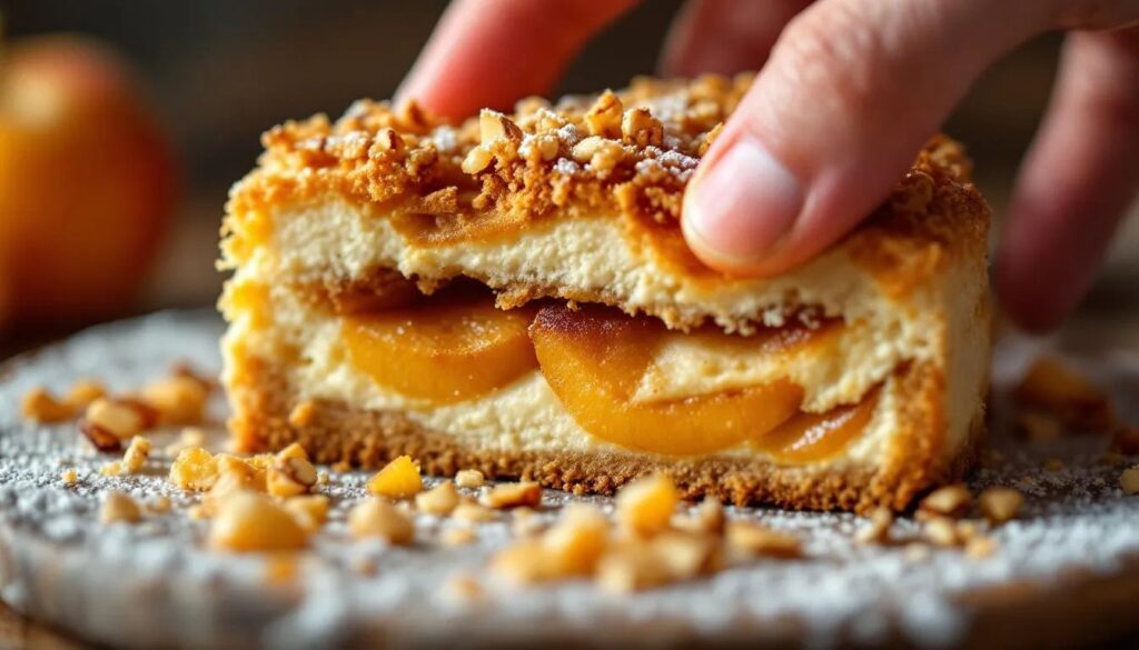 Im Kühlschrank, gut abgedeckt, hält sich der Apfel-Käsekuchen bis zu 3 Tage. Da er Frischmilchprodukte enthält, sollte er nicht bei Zimmertemperatur stehen gelassen werden. Einfrieren ist möglich — dafür den Kuchen in Stücke schneiden, einzeln in Frischhaltefolie wickeln und in einem Gefrierbeutel lagern. Haltbarkeit im Gefrierfach: bis zu 2 Monate. Der Knusper verliert beim Auftauen etwas an Crunch, lässt sich aber durch kurzes Erwärmen im Backofen (bei 150 °C, 5–8 Minuten) weitgehend wiederherstellen.